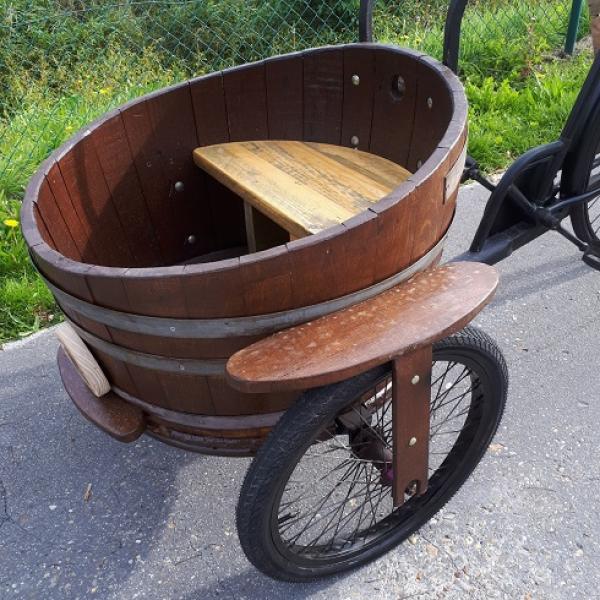 Kleine bakfiets met een halve ton vooraan, met zitbankje.